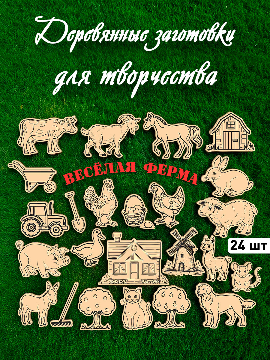 Набор деревянных заготовок «Весёлая ферма», 25 шт. — фигурки из натуральной фанеры, идеально подходящие для раскрашивания, декорирования, творчества и детского развития. В комплект входят животные, трактор, сарай, деревья, домик и другие элементы фермерской тематики. Размер элементов — от 3 до 6 см. Преимущества: Подходит для детского творчества, поделок, игр и уроков Можно использовать для создания магнитов, брошей, открыток, настольных игр Подходит для методик раннего развития (в т.ч. Монтессори) Безопасный натуральный материал — шлифованная фанера Гладкая поверхность — готова к росписи и декору Состав набора: корова, лошадь, коза, ослик, овца, свинья, курица, петух, утка, кролик, кошка, собака, мышка, лама, трактор, тележка, сарай, мельница, фермерский домик, деревья и другие тематические элементы. Набор станет отличным подарком для ребёнка, увлечённого творчеством, а также полезным материалом для педагогов, родителей и мастеров хендмейда.